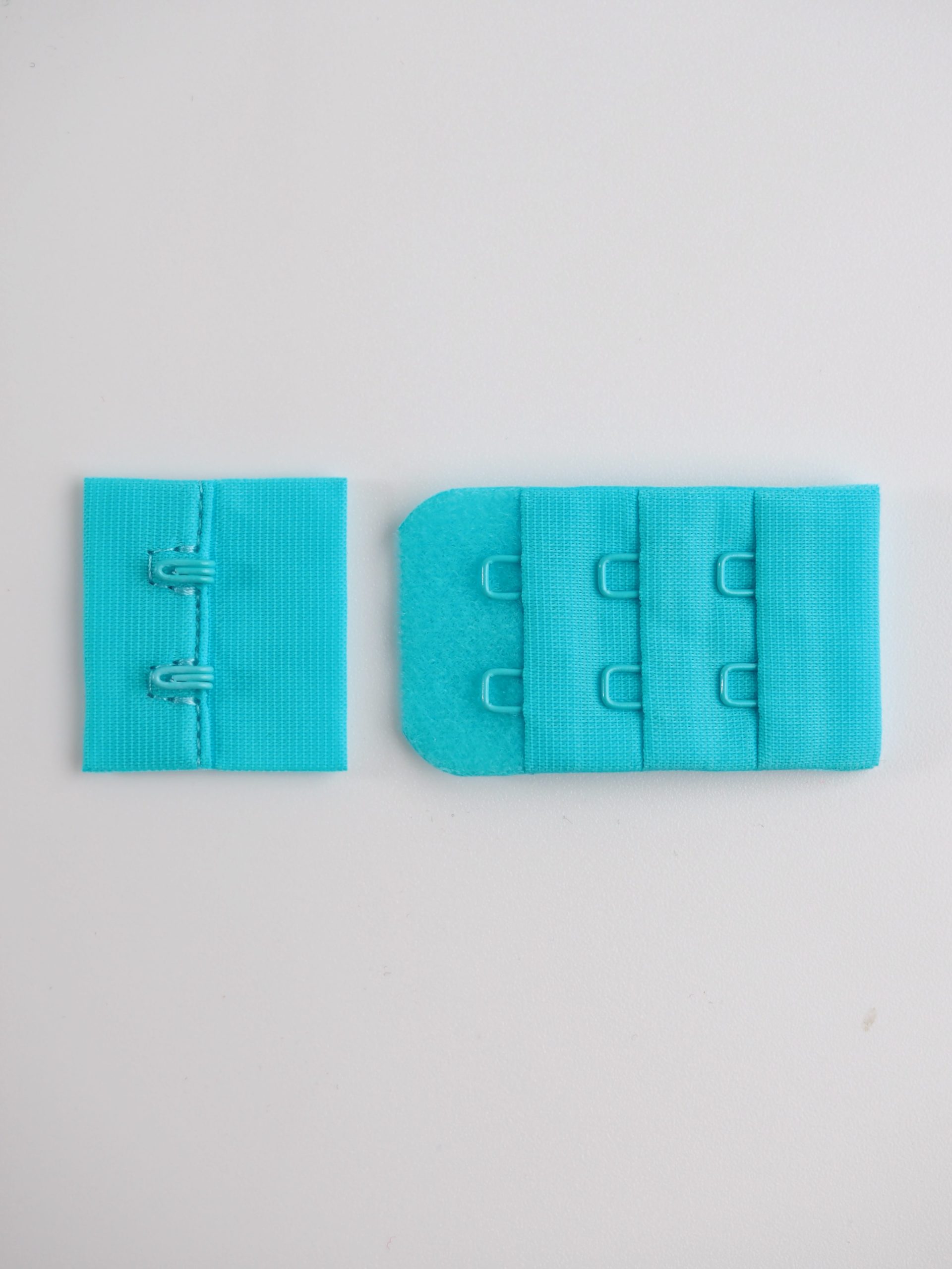 Застежка для бюстгальтера ярко-голубая состоит из 2-х частей. Первая часть - это текстильная основа с 2-мя металлическими крючками, вторая - текстильная основа с 2-мя металлическими петлями в 3 ряда. Обратная сторона текстильной части застёжки бархатистая с начёсом.
