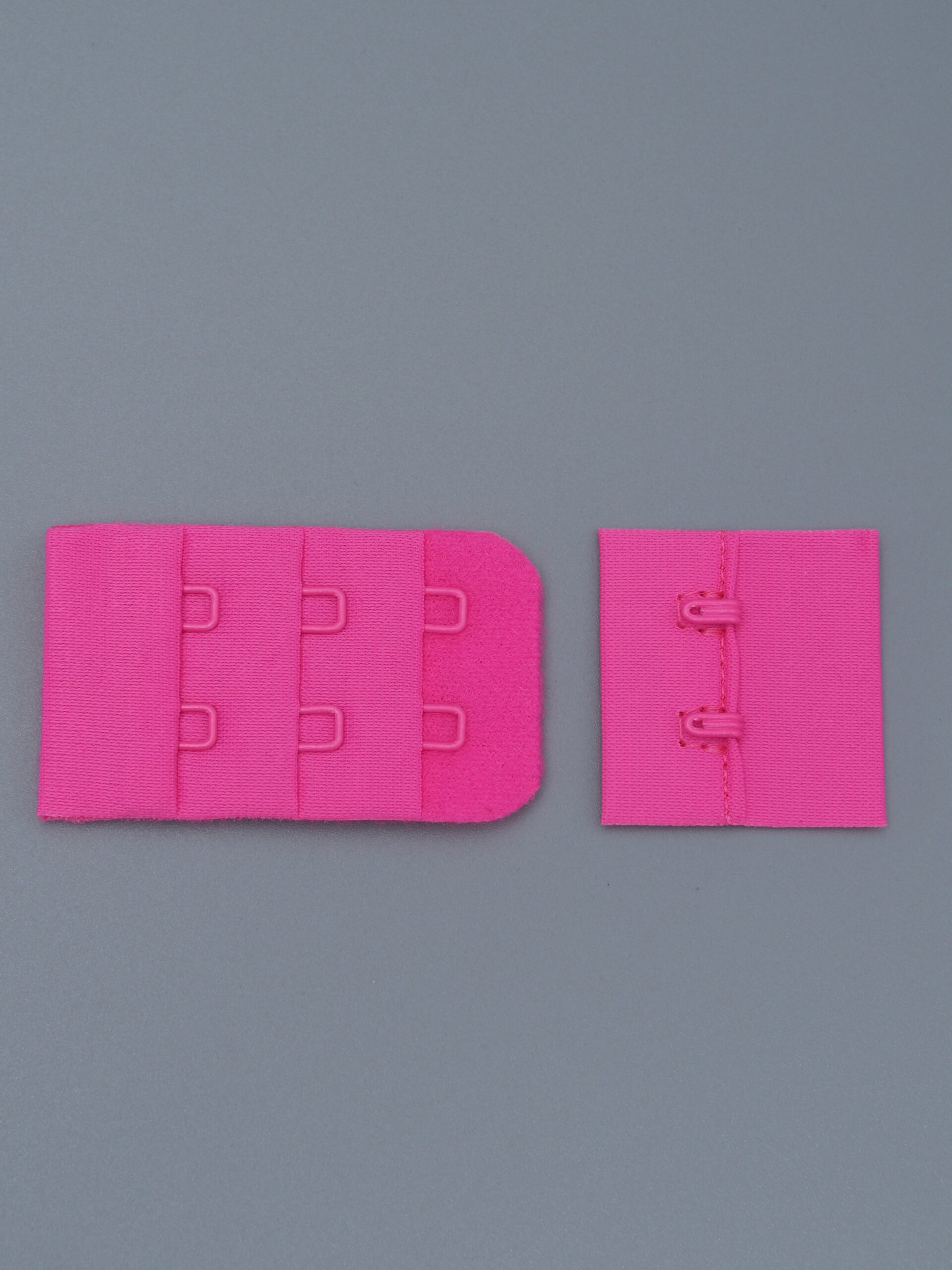 Застежка текстильная для бюстгальтера состоит из 2-х частей. Первая часть - это текстильная основа с 2-мя металлическими крючками, вторая - текстильная основа с 2-мя металлическими петлями в 3 ряда. Обратная сторона текстильной части застёжки бархатистая с начёсом.