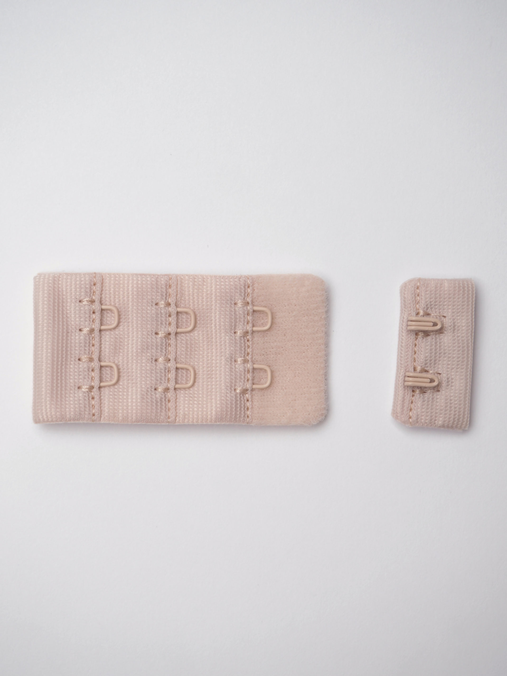 Застежка текстильная для бюстгальтера состоит из 2-х частей. Первая часть - это текстильная основа с 2-мя металлическими крючками, вторая - текстильная основа с 2-мя металлическими петлями в 3 ряда. Обратная сторона текстильной части застёжки бархатистая с начёсом.